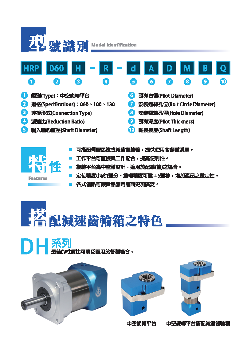 HRP系列是品宏轉(zhuǎn)角減速機系列。 可搭配伺服馬達或減速齒輪箱,提供使用者多種選擇。 工作平臺可直接與工件配合,提高便利性。 旋轉(zhuǎn)平臺為中空軸設(shè)計,適用于配管之場合。 定位精度小于1弧分,重復精度可達±5弧秒,增加產(chǎn)品之穩(wěn)定性。 各式優(yōu)點可讓產(chǎn)品應用層面更加廣泛。
