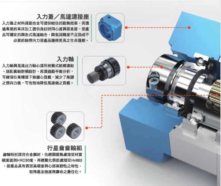 由一個內齒環(huán)(A)緊密結合於齒箱殼體上,環(huán)齒中心有一個自外部動力所驅動之太陽齒輪(B),介於兩者之間有一組由三顆齒輪等分組合於托盤上之行星齒輪組(C)該組行星齒輪依靠著出力軸、內齒環(huán)及太陽齒支撐浮游於期間;行星減速機當入力側動力驅動太陽齒時,可帶動行星齒輪自轉,并依循著內齒環(huán)之軌跡沿著中心公轉,游星之旋轉帶動連結於托盤之出力軸輸出動力。