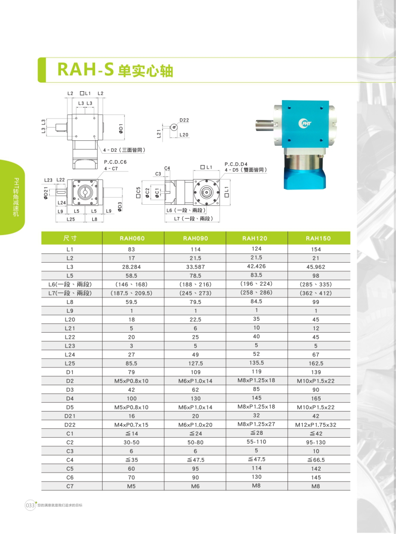 RAH-S系列是單實(shí)心軸設(shè)計(jì)。 鋁合金材質(zhì)可提高散熱能力,減緩溫升現(xiàn)象造成影響。 多樣化的出力軸可因應(yīng)各種場(chǎng)合,客制化的入力端可搭配各式馬達(dá)。 提供各式特色之減速機(jī),供使用者依需求選購。 特殊油封設(shè)計(jì),正常使用下不需保養(yǎng)亦不用更換潤滑油,可延長(zhǎng)使用壽命。 各式特色,體積小,省空間,噪音低,輸出扭矩高,安裝容易,可搭配馬達(dá)型號(hào)廣泛。 RAH搭配DM,一體成型的齒輪組,可有效的減低噪音。 RAH搭配DH,最佳的性價(jià)比,可廣泛應(yīng)用于各種場(chǎng)合。