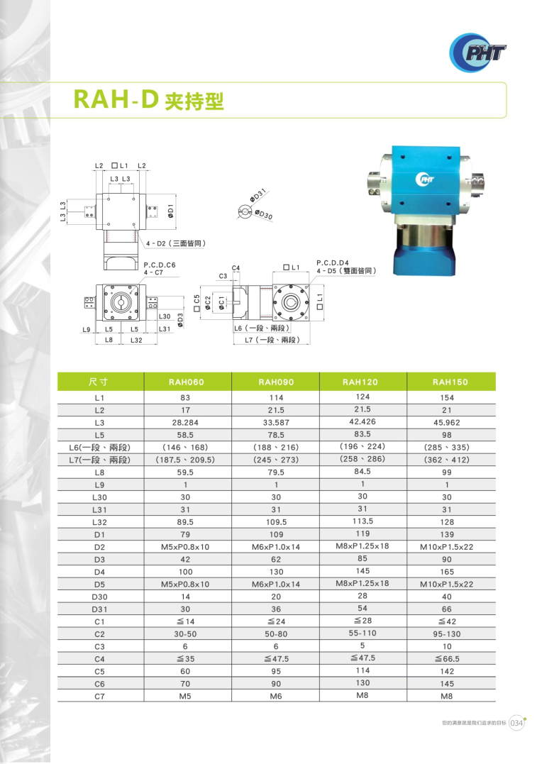 RAH-D系列是夾持型設(shè)計(jì)。 鋁合金材質(zhì)可提高散熱能力,減緩溫升現(xiàn)象造成影響。 多樣化的出力軸可因應(yīng)各種場(chǎng)合,客制化的入力端可搭配各式馬達(dá)。 提供各式特色之減速機(jī),供使用者依需求選購。 特殊油封設(shè)計(jì),正常使用下不需保養(yǎng)亦不用更換潤滑油,可延長使用壽命。 各式特色,體積小,省空間,噪音低,輸出扭矩高,安裝容易,可搭配馬達(dá)型號(hào)廣泛。 RAH搭配DM,一體成型的齒輪組,可有效的減低噪音。 RAH搭配DH,最佳的性價(jià)比,可廣泛應(yīng)用于各種場(chǎng)合。