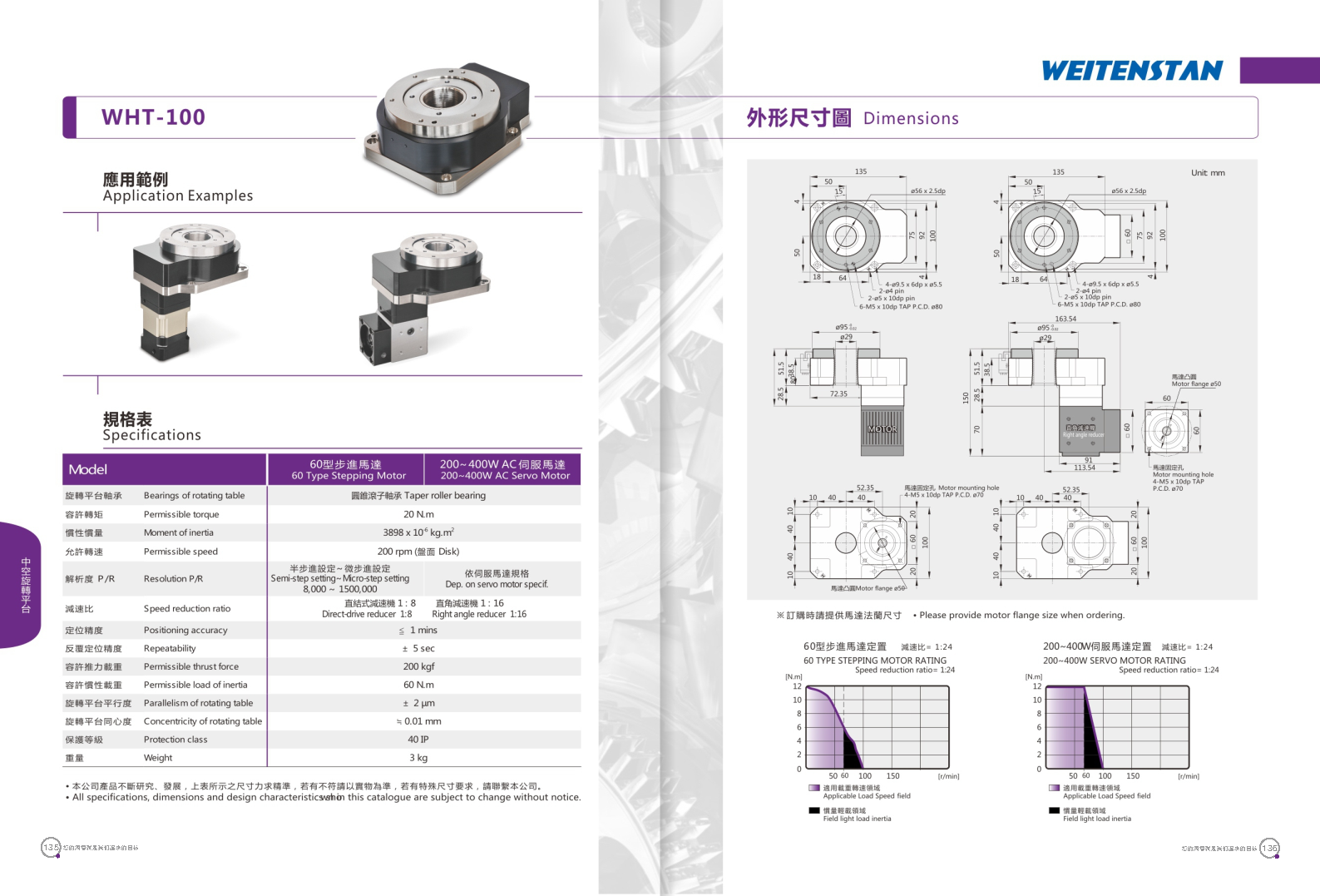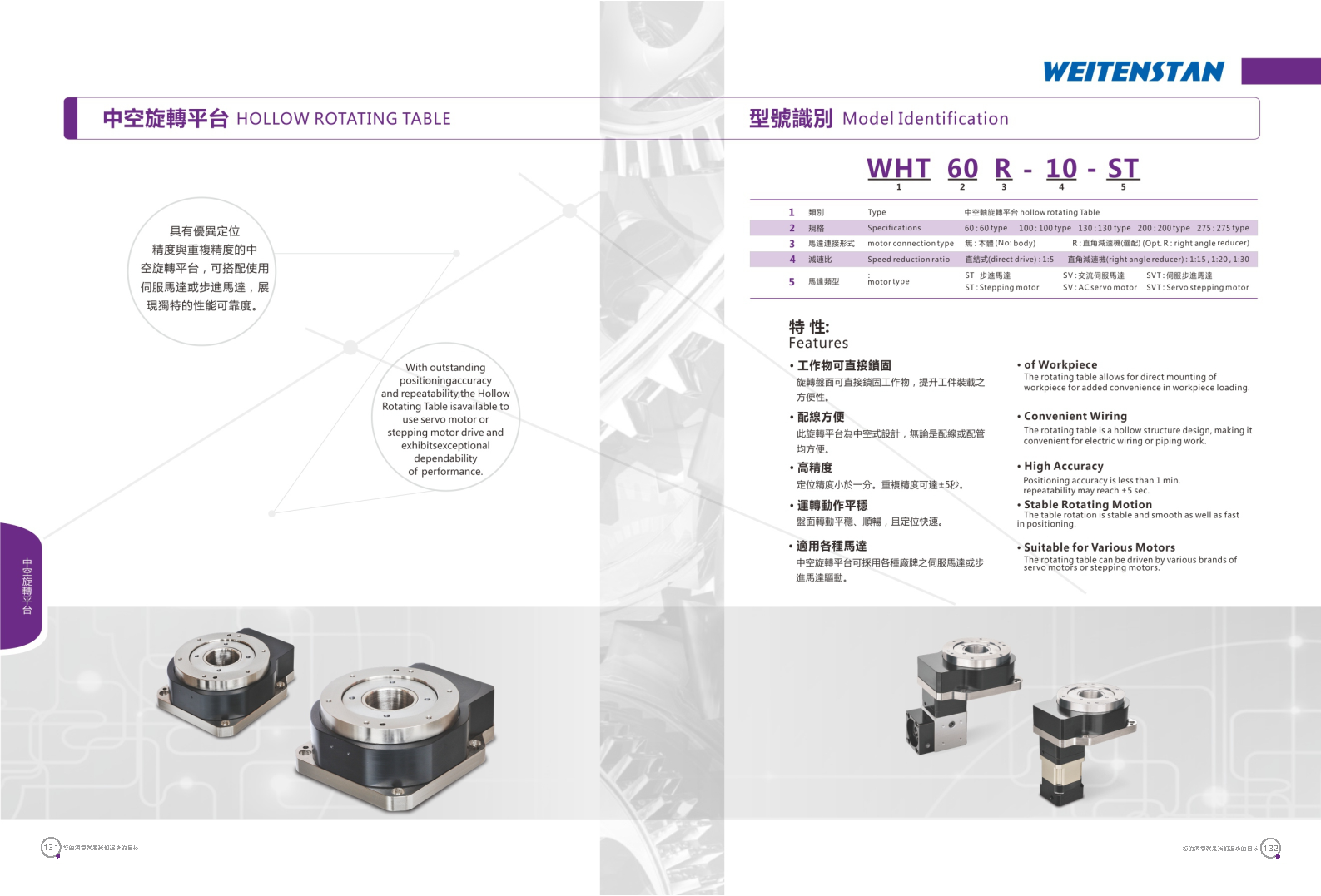 WHT系列中空旋轉(zhuǎn)平臺(tái)。 具有優(yōu)異定位精度與重復(fù)精度的中空旋轉(zhuǎn)平臺(tái),可搭配使用伺服馬達(dá)或步進(jìn)馬達(dá),展現(xiàn)獨(dú)特的性能可靠度。 工作物可直接鎖固。旋轉(zhuǎn)盤面可直接鎖固工作物,提升工件裝載之方便性。 配線方便。此旋轉(zhuǎn)平臺(tái)為中空式設(shè)計(jì),無論是配線或配管均方便。 高精度。定位精度小于1分。重復(fù)精度可達(dá)±5秒。 運(yùn)轉(zhuǎn)動(dòng)作平穩(wěn)。盤面轉(zhuǎn)動(dòng)平穩(wěn),順暢,且定位快速。 適用各種馬達(dá)。中空旋轉(zhuǎn)平臺(tái)可采用各種廠牌之伺服馬達(dá)或步進(jìn)馬達(dá)驅(qū)動(dòng)。