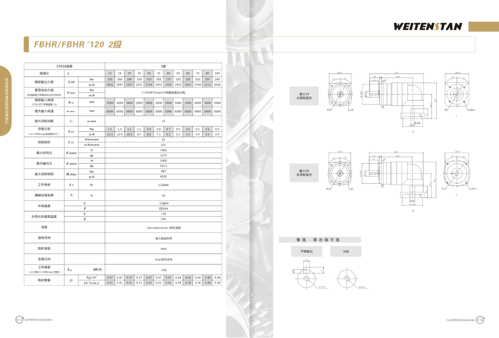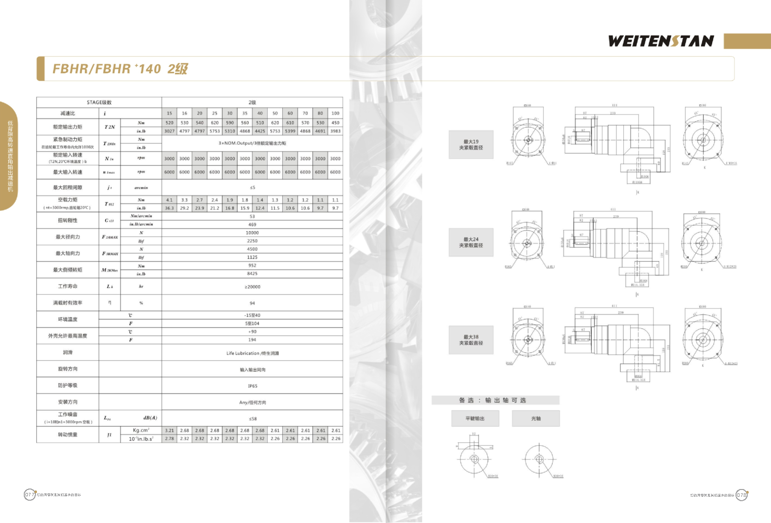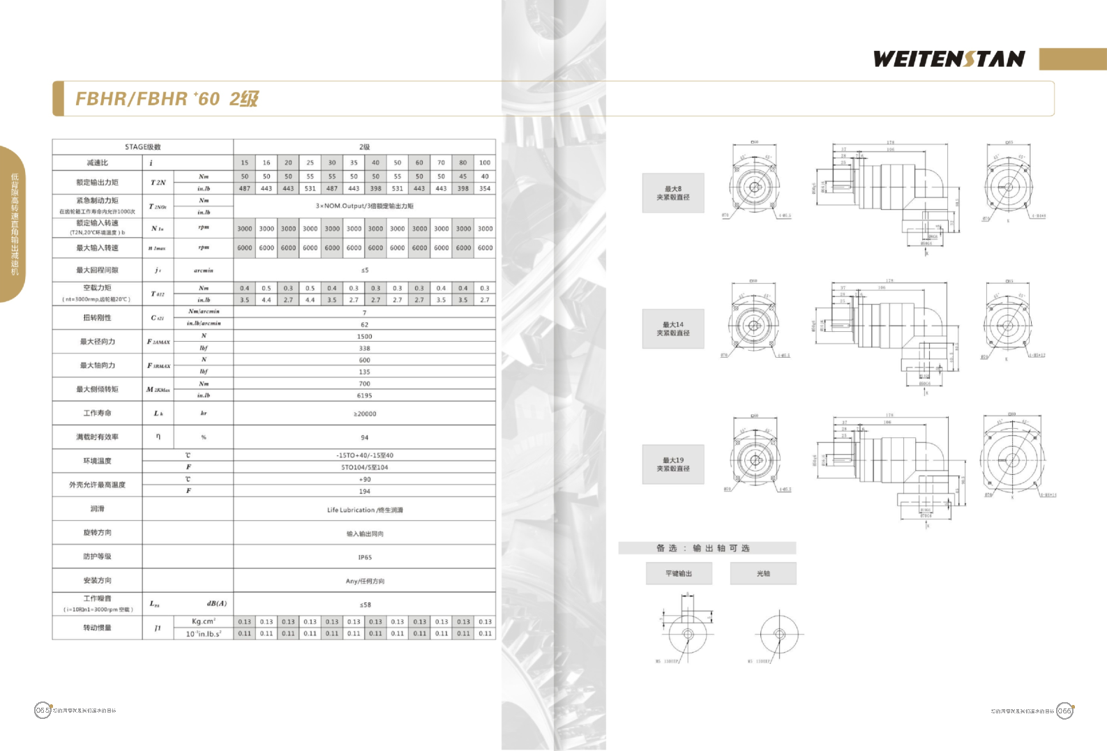 FBHR系列低背隙高轉(zhuǎn)速直角輸出減速機(jī)。 FBHR產(chǎn)品系列的轉(zhuǎn)角式減速機(jī),標(biāo)準(zhǔn)規(guī)格的轉(zhuǎn)角輸出適用于高精度高轉(zhuǎn)速的連續(xù)工作。 極高的功率密度。盡管以往系列性能極為出色,但我們成功的將扭矩提高了近40%。不斷提高極限值,典型威騰斯坦產(chǎn)品! 電機(jī)安裝簡易。電機(jī)可安全簡易的一步安裝,另外您也可以選擇威騰斯坦享有的專利權(quán)的,帶有長度補(bǔ)償軸的安裝。 任意位置安裝。不管你在哪個(gè)位置安裝,你的齒輪箱始終有相同的潤滑油/潤滑脂量。安裝靈活、齒輪箱能夠垂直、水平、與從動(dòng)軸一起向上或向下安裝。 極高的定位精度。根據(jù)用戶需求,你可獲得回程間隙小于角分的高型行星齒輪箱。這也大大提高了你應(yīng)用上的定位精度。 通過齒輪嚙合,運(yùn)轉(zhuǎn)平穩(wěn)。相比直齒嚙合齒輪箱,本公司的斜齒嚙合齒輪箱運(yùn)轉(zhuǎn)噪音減低了50dB-A,你深知50dB-A所創(chuàng)造的價(jià)值遠(yuǎn)遠(yuǎn)高于70dB-A。此外還有:不再感動(dòng)振動(dòng),運(yùn)轉(zhuǎn)平穩(wěn)到令人驚訝。 世界水平的預(yù)期壽命。原材料進(jìn)行了優(yōu)化,幾何形狀同樣進(jìn)行了優(yōu)化。